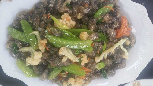 烹制蚵柳,先要挑選好個肥形大的鮮蚵,用心幾遍洗凈,再用篩細(xì)的地瓜粉薄薄拌勻,務(wù)求每只蚵仔獨立成團(tuán),再兜在漏勺里到滾開的水里焯一下即起來,再攤放有竹篩簸里晾干瀝水一個晚上。第二天中午烹制,先把油燒熱,倒入生姜末過油,再依次倒入花菜、荷蘭豆、紅蘿卜絲、芫荽等“菜腳”與鹽、雞粉、料酒、蠔油、胡椒粉、醋等佐料一并翻炒,菜蔬生汁,試嘗咸淡,再倒入已備好的蚵仔團(tuán)翻炒,只需幾下,便已熟透,即可裝盤。