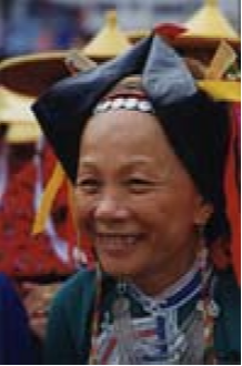 惠東老年婦女一般在腦后梳一發(fā)髻,近似長(zhǎng)方形,然后套上發(fā)網(wǎng),壓平,左右各插一個(gè)別子,上方和中部各插一支梅花,再圍上一條黑巾,用飾有珠花的別針別上。