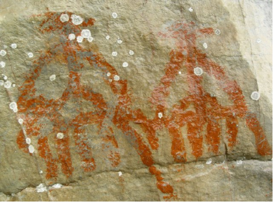 巖畫在石壁低部內(nèi)凹,可避雨,并有四處洞穴,依次下降,位置較高者為一出水洞,四季有水,其它洞穴開口小,內(nèi)部較寬、干燥,洞口處對應(yīng)石壁項(xiàng)部有明顯煙熏遺跡,似人為造成。