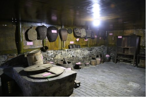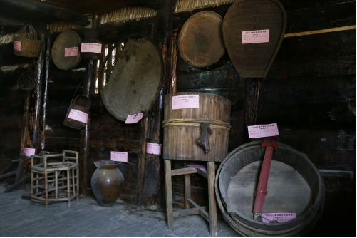 “農(nóng)耕文化陳列館”是由兩棟傳統(tǒng)的木質(zhì)民房改建,從大門進(jìn)來,門的兩邊放置有農(nóng)具,右側(cè)一個(gè)是存儲(chǔ)糧食的倉庫,沿著倉庫邊上的石階往上走,從小門進(jìn)去,大大小小的簸箕、飯甑、貓籮、魚籮等農(nóng)具應(yīng)有盡有。