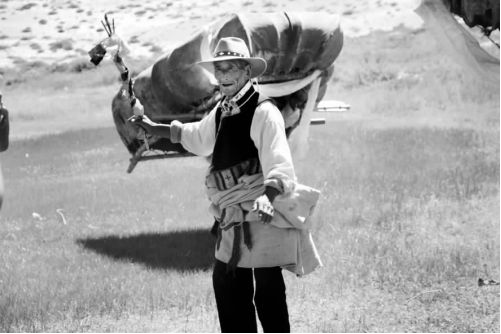 第三段叫“挑哈達(dá)”。“阿熱”唱《祝福歌》并從藏袍里取出哈達(dá),邊跳邊放在沙地上,牛皮船舞者們邊跳邊向前彎腰,用背著的牛皮船的左右上角從地上挑起哈達(dá)。第四段,唱《祝福歌》,歌詞大意是:“我們在此相會,但愿經(jīng)常相會,經(jīng)常相見的人們,祝你們身體健康?!背旰蟆鞍帷鳖I(lǐng)頭向觀眾行禮下場。