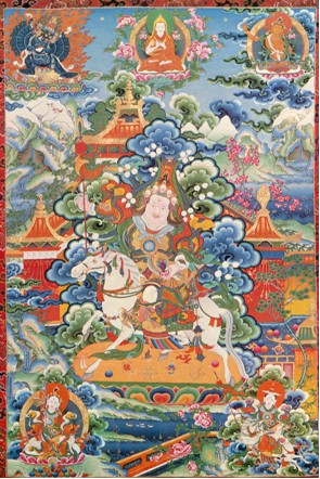 勉塘畫派是15世紀以后影響最大的繪畫流派,主要流行于衛(wèi)藏地區(qū)及昌都部分地區(qū)。該畫派的創(chuàng)始人是勉拉頓珠,他出生于洛扎勉塘(今山南地區(qū)),勉塘畫派由此而得名。他大約出生于公元十五世紀20年代或30年代。據(jù)史料記載,勉拉頓珠出生的時間正好與他家鄉(xiāng)發(fā)現(xiàn)了朱砂礦的時間一致。這種重要繪畫顏料的出現(xiàn),預示著一代繪畫大師降臨人世。他自幼聰慧,毫不費力地學完各種字體的書寫、大小五明中的絕大多數(shù)內(nèi)容。成年后,拜后藏一帶的著名美術(shù)大師多巴扎西杰布為師,苦心鉆研,在繪畫藝術(shù)領域取得了很深的造詣。通曉了藏、漢、印、尼泊爾等各種繪畫派別的技法,他根據(jù)《續(xù)部》等編寫了繪畫理論專著《造像量度如意寶》,并創(chuàng)立了勉塘畫派。他參與了一世達賴喇嘛根敦朱巴與1447年創(chuàng)建的扎什倫布寺措欽大殿壁畫繪制工程的全過程,單獨完成了北壁的《釋迦牟尼與十六羅漢圖》與《八十大成就者環(huán)圍金剛持》兩幅壁畫,在西壁勉拉頓珠親手繪制了《釋迦牟尼十二宏化圖》的白描部分。另外在該寺以及同時代建造的諸多廟宇繪制完成了大量的壁畫、巨幅堆秀唐卡及小型唐卡。其中最負盛名的是扎什倫布寺的巨幅堆秀唐卡《釋迦牟尼》,其大小約為長32.9米、 寬19.3米。該畫派造像法度精嚴,與傳統(tǒng)的表現(xiàn)手法相比,尤其注重線條的運用,線條工整流暢,色調(diào)活潑鮮亮,變化豐富,人物體態(tài)、骨相和肌膚都異常完美,脖頸較長,高度和諧的色彩和色調(diào)的配制十分突出。畫面暈染充分,用色細膩、柔和、富麗堂皇。由于石青和石綠色突出,從遠處看,繪畫作品十分優(yōu)美和靜。衣袍和飾帶呈不對稱形式,棋格使構(gòu)圖消失,諸神位于云端風景之中,布局活躍多變,背光中卷草圖案等變成了波浪式放射的金線,該派擅長表現(xiàn)和靜類神像。