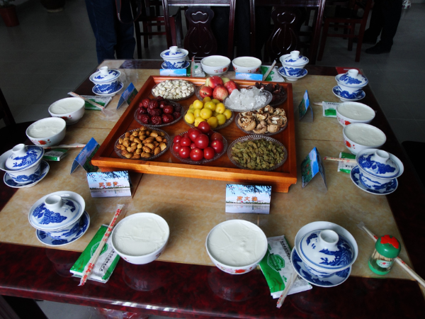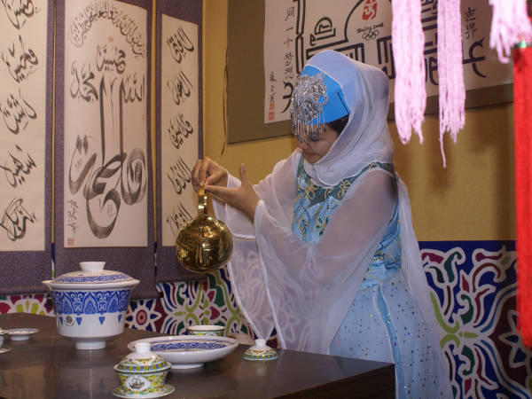 回族普遍喜歡飲茶?;刈逑让裣彩程鹌?,在中國茶文化影響下,形成了以甜味為特色的飲茶習(xí)慣。飲茶之風(fēng)興起于中國晉代,盛于唐代以后,隨之出現(xiàn)了茶具,其中以包括茶托、茶碗、碗蓋的“三坯胎”蓋碗美觀實(shí)用?;刈謇^承發(fā)展了這種茶文化,形成了以“三炮臺”為茶具的“八寶蓋碗茶”:在茶具中放入茶葉(茉莉花茶、陜青茶、紅磚茶、窩窩茶、毛尖等)、糖(白糖、紅糖、冰糖、梨膏糖等)及紅棗、核桃仁、桂圓肉、芝麻、葡萄干、枸杞(或柿餅、山楂、姜片、果干)等配料,用開水沖制后飲用。茶葉及配料在不同的地區(qū)、不同的季節(jié),根據(jù)飲茶者的身體狀況與喜好有不同的搭配,如“紅糖磚茶”“冰糖陜青茶”“三香茶”(茶葉、糖、桂圓)、“白四品”(陜青茶、白糖、柿餅、紅棗)、“紅四品”(磚茶、紅糖、紅棗、果干)、“五味茶”(綠茶、山楂、芝麻、姜片)等。八寶茶具有生津解渴、開胃健脾的作用,放入不同的茶料,又具備了不同的健身康體功能。