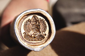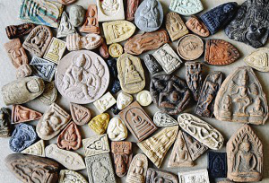 我在曼谷一家有40年歷史的佛像店“佛光工藝社”采訪時問到老專家這樣一個問題:泰國現(xiàn)在大概有多少種圖案的帕肯?所有聽到這個問題的人都是一聲驚嘆,然后笑說:“無數(shù)!”我非要問出個數(shù)來,他們便告訴我,泰國是一個歷史劃分復(fù)雜、族源廣博的國家,因此其包容性很強,雖然九成以上的人信仰佛教,但是婆羅門教、道教、伊斯蘭教、基督教等在泰國都被接納,還有本土的一些法術(shù)也不曾被丟棄。所以,每天每個來定做的人都會有不同材質(zhì)的要求,不同圖像、符咒的組合,僅一個工藝社40年來就已經(jīng)做過幾十萬種的圖案組合。我收藏的擦擦有不同年代、不同材質(zhì)、不同價值的,除去年代久遠的,頗有價值的就是一個藥擦,那是一個大威德金剛擦,專家說從被剝落的剖面看,里面有藥材的成分。我知道,在西藏,擦擦因材質(zhì)和制作人不同而有很大的區(qū)別。擦擦中最為稀有難求的一種叫“布擦”,那是寺廟僧人在保存活佛法體的時候,將那些浸透活佛法身血水的鹽巴或其它藥物和泥土融合后制成的。另一種較為珍貴的擦擦是活佛的骨灰與泥土摻混在一起制作而成的。還有一種藥物擦擦,是用不同的名貴藥材如珍珠、瑪瑙、藏紅花等藏藥合成制作,可服用治病。最普通的擦擦用一般的泥土制作,好一點的有膠泥、陶土、白泥等,這種擦擦成本低廉,在民間流傳最廣。