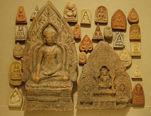在泰國最北邊的城市清萊的一座古寺里,年長的僧人告訴我,在泰國,帕肯(“泰國擦擦”,泰語為“Phra-Kruang”,這個名詞在標(biāo)準(zhǔn)的泰文詞典里的解釋是:用于避兇消災(zāi)的小型佛像,作用相當(dāng)于護身符、祈愿物、供奉物。泰國的Phra-Kruang至今沒有一個公認的中文名稱,既然“擦擦”是譯音,我便挑了兩個最接近泰語Phra-Kruang發(fā)音的字給它:帕肯)的使用方式是這樣的:最早是在修建寺廟的時候放入佛塔內(nèi),因為古帕肯的內(nèi)容全是佛像,經(jīng)過高僧們開光后放入塔內(nèi)有增加靈氣的作用。百姓通常是到寺廟請回自己需要的帕肯回家供奉,或者作為還愿,出資請寺廟制作一定數(shù)量的帕肯,供奉在寺廟、家中或者贈送親友。