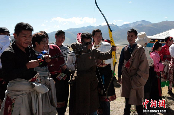 圖為青海省玉樹藏族自州當(dāng)?shù)孛癖娺M(jìn)行射箭比賽來慶祝“沐浴節(jié)”到來。來源:中新社 攝影:孫睿