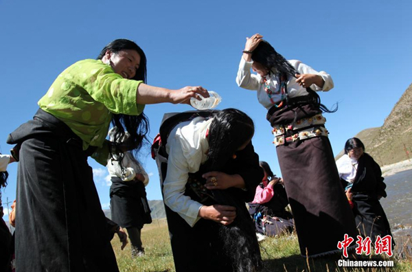 37歲的藏族青年旦增跟記者開玩笑,“自己看上去比實(shí)際年齡年輕,就是因?yàn)槟昴甓紒磴逶 !彼X得藏族民眾初秋過“沐浴節(jié)”,能夠提高抵抗力,與內(nèi)地所講的“春捂秋凍”本質(zhì)相同。旦增介紹說,不能在流水中過“沐浴節(jié)”的藏族民眾,會在月光照過的盆中凈水洗頭。