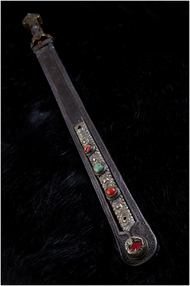 安多地區(qū)主要以放牧為主,牧民的刀主要用于宰殺和吃肉,有嚴(yán)格的男用女用之分,男式刀長度在一尺以上,女式刀在一乍左右,刀鞘的底部和刀柄的末端上翹,呈船形。安多人喜歡珠寶,頭飾、胸飾、腰飾無不光燦耀人,這些飾物同樣被用在刀上,刀鞘和刀柄錨金錯(cuò)銀,鑲嵌著珊瑚和綠松石,像精美的藝術(shù)品。