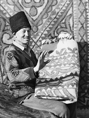 這時,亞生已經開始了第二步,他把彈好的羊毛鋪勻,開始噴灑開水。只見他熟練地把水噴向羊毛,然后和妻子一起快速把簾子卷好,用羊毛繩綁緊,再用腳踏著卷好的簾子在平地上來回踏蹬,這樣不停地重復后,做成了氈坯。亞生停下來解開簾子,拉平氈坯,修整好邊角,又灑上熱開水,把氈坯卷起,這是工藝最關鍵也是最后一步——他們一起跪在簾上,用雙臂反復搓滾氈坯,感覺已經平整了,夫婦倆又齊心協(xié)力把氈坯展開拉平,放到院子里。此時,亞生長出了一口氣,抹抹頭上的汗說:“晾干了就可以賣了!”