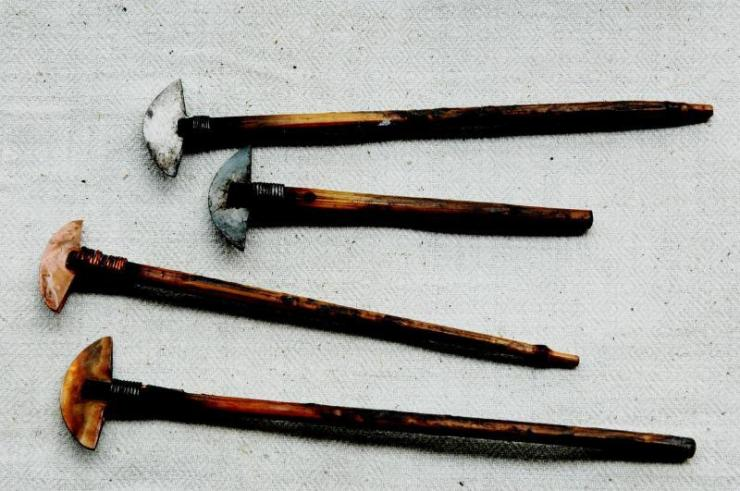 繪制蠟花的工具是一種特制的銅刀,而不是毛筆,因為毛筆容易被蠟冷卻凝固。這種銅刀是用兩片或多片形狀相同的薄銅片組成,一端縛在木柄上。刀口微開而中間略空,以易于蘸蓄蜂蠟。根據(jù)繪畫各種線條的需要,有不同規(guī)格的銅刀,一般有半圓形、三角形、斧形等。蠟染的基本原理是在需要白色花型的地方涂抹蠟質(古代是蜂蠟,現(xiàn)代是石蠟、蜂蠟、木蠟等混合蠟),然后去染色,沒有涂蠟的地方染成藍色,有蠟的地方呈現(xiàn)白色,行話叫做“留白”。