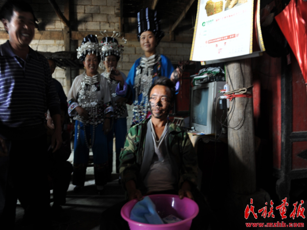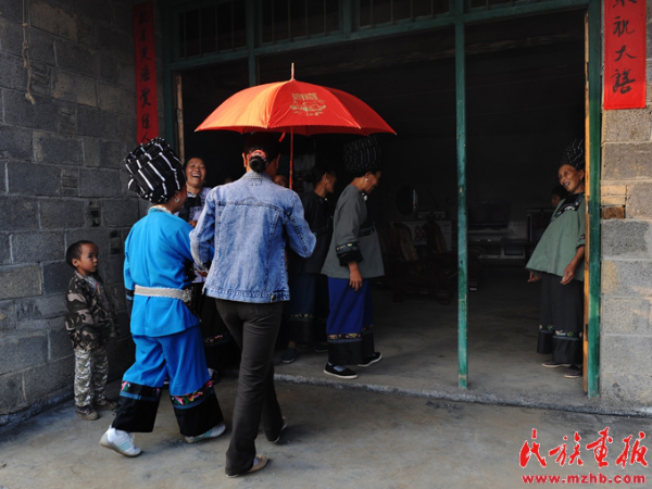姑娘出嫁必須有娘家人陪送,婚禮這一天清早,“新娘”便在“接親客”的帶領(lǐng)和送親隊伍的陪同下,一路歡聲笑語 ,浩浩蕩蕩向“新郎”家走來。走到新郎家村邊,有的燃放鞭炮,一直燃放到新郎家門口,請新郎父母出來開門;無鞭炮準(zhǔn)備的,則在寨邊稍候,由迎親伙伴飛報新郎家做好迎親的準(zhǔn)備。男方父母聽到后,多數(shù)是很高興地喊醒家中兒女,由新郎的妹妹或堂姐妹為迎親主體,加上寨上的姐妹和房族組成迎親隊伍,打開大門,把新娘迎進家來。接親的主要儀式是接傘。接傘的人必須是新郎的小妹或堂妹。無親妹、堂妹者則由新郎父母指定一與新郎同輩份的小姑娘去接。新娘走至大門,即由新郎的妹妹跨出門外迎接新嫂子,新嫂子接著用左手把雨傘遞給接傘的妹妹,接傘妹妹接過新嫂子手中的雨傘后,新娘即用左腳跨進屋內(nèi),以示今后成為新家庭的主婦。隨即由接傘妹妹攜新娘手迎入新房,迎親婦女們陸續(xù)進入新房休息。入門后,新郎家的“陪娘”及姑娘們便熱情地安排“送親客”團團圍坐,并簇擁著“新娘”緊靠堂屋中柱子就坐,意為“新娘”從此當(dāng)家立業(yè),將來就像中柱子一樣,頂大梁,撐起這個家。