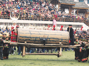今年適逢雷山縣多個(gè)村寨過13年一次的鼓藏節(jié),2000余名苗族同胞在開幕式上再現(xiàn)了古老神秘的祭鼓儀式。鼓藏節(jié)也是緬懷先人、祭祀祖宗的古老節(jié)日,過節(jié)期間,家家宰豬祭祖,走親訪友,舉行跳蘆笙舞、斗牛等民間傳統(tǒng)活動(dòng)。