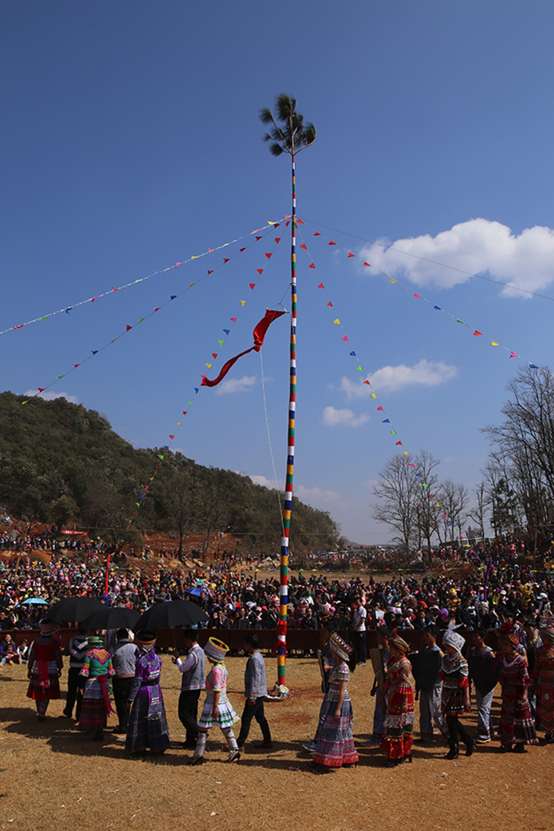 依布底一起去踩花山的人組成長長的摩托車隊(duì),老阿婆腰桿筆挺盛裝坐在摩托車后座上。等他們來到大布紅村的花山場時(shí),那里早已人山人海,空地上山坡上也擠滿了衣著鮮艷的人群。
