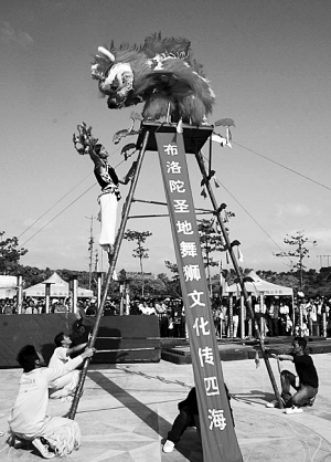 舞獅者可以攀上20多張高凳疊成的“金山”頂上施展雄姿,可以在懸空的鋼絲繩上如履平地般跳躍翻騰,可以在閃閃發(fā)光的刀山頂上表演堪稱“世界一絕”的刀尖頂肚旋轉(zhuǎn)。