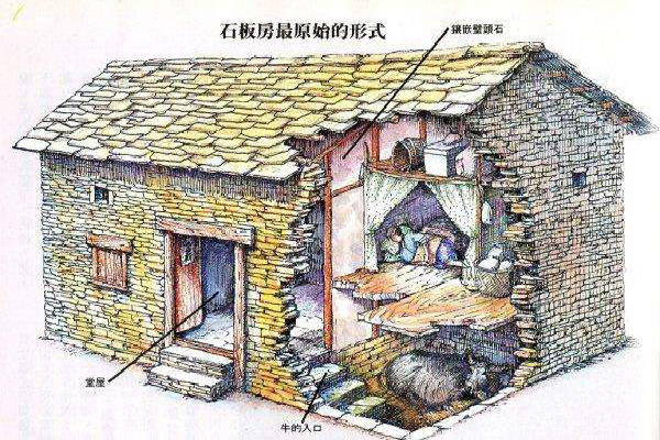 石板房以石條或石塊砌墻,墻可壘至5至6米高;以石板蓋頂,風雨不透??傊?,除檁條、椽子是木料外,其余全是石料,甚至家用的桌、凳、灶、缽都是石頭鑿的。一切都樸實無華,固若金湯。這種房屋冬暖夏涼,防潮放火,相對采光較差。