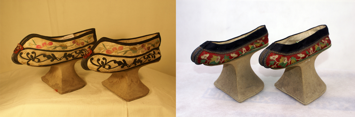 “旗鞋”款式獨(dú)特,是一種高木底繡花鞋,又稱“高底鞋”“花盆底鞋”“馬蹄底鞋”等。其木底高跟一般高5-10厘米,最高可達(dá)25厘米。一般用白布包裹,然后鑲在鞋底中間腳心部位。跟底形狀通常有兩種,一種上敞下斂,呈倒梯形花盆狀。另一種是上細(xì)下寬、前平后圓,其外形及落地印痕皆似馬蹄?!盎ㄅ璧住焙汀榜R蹄底”鞋由此得名。除鞋幫上飾以蟬蝶等刺繡紋樣或裝飾片外,木跟不著地的部分也常用刺繡或串珠加以裝飾。有的鞋尖還飾有絲線編織的穗子。這種鞋的高跟木底極為堅(jiān)固。