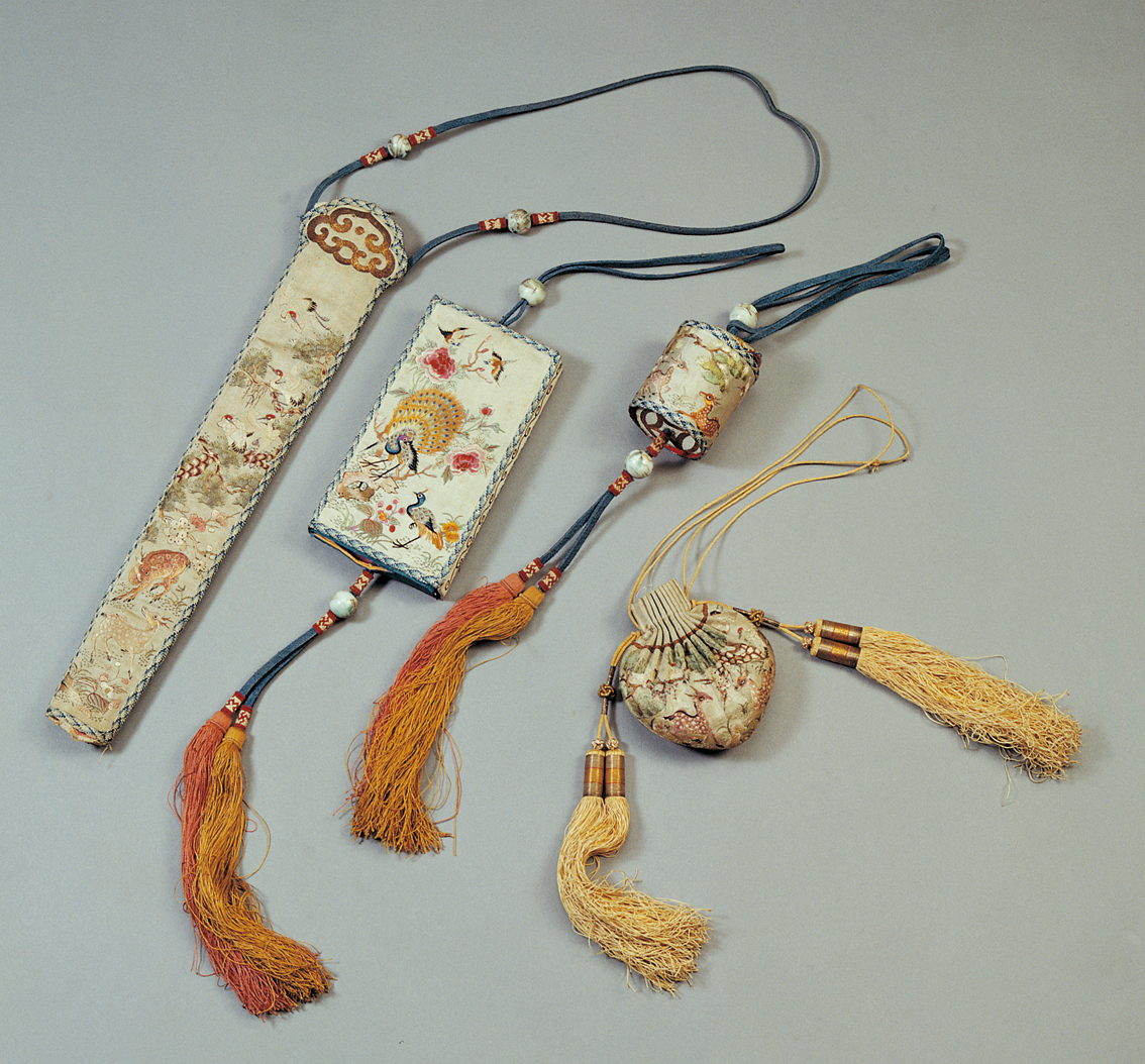 滿族服飾色彩多以淡雅的白色、藍(lán)紫色為主,紅、粉、淡黃、黑等色也是其服飾的常用色。白色在滿族服飾中是一個(gè)重要的顏色,因?yàn)椋瑵M族傳統(tǒng)上有尚白習(xí)俗,以白色為潔、為貴,白色象征著吉祥如意,所以,在滿族服飾中常在紅色、藍(lán)色等其他顏色的旗袍上鑲白色的花邊。滿族男女都喜愛在腰間或衣服的大襟上掛佩飾。男子有火鐮、耳勺、牙簽、眼鏡盒、扇帶。滿族女子喜歡盤頭翅,梳兩把頭或旗髻,戴耳環(huán)、手鐲、戒指、頭簪、大絨花和鬢花等各種裝飾品。擅長刺繡,她們在衣襟、鞋面、香囊、荷包、枕頭等物品上刺繡花卉、芳草、鶴鹿、龍鳳等吉祥圖案(圖為滿族清代繡花湖色緞佩飾,中央民族大學(xué)民族博物館館藏)。