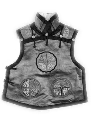 坎肩,又稱背心、馬甲。巴圖魯坎肩是京師八旗旗人最時(shí)尚的一種款式,其樣式是在“一字形”的前襟上裝有排扣,兩邊腋下也有紐扣?!鞍蛨D魯” 一詞源自少數(shù)民族語(yǔ),是我國(guó)北方某些民族專門賜給強(qiáng)悍勇士們的美稱。 巴圖魯坎肩源于蒙古族杜爾伯特部男子穿兩邊有衩的大襟短坎肩。早先有27道扣袢兒,胸前9道扣袢兒,兩側(cè)各9道扣袢兒,后來(lái)變成胸前9道,兩側(cè)各7道扣袢兒,以白色綢緞為面料,以青色綢緞為沿邊兒。巴圖魯坎肩從前是兵卒之服,早先在面料和里子之間安放魚(yú)鱗式薄鐵片,作為保護(hù)身體的甲片。