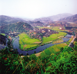 侗家人聚族而居,多是一姓一寨,或幾戶同寨,但分片而居。村寨多建于有河流的山腳下,榕樹(shù)參天、群山環(huán)抱、流水潺潺,寨邊風(fēng)雨橋橫跨村頭寨腳的溪流之上。寨內(nèi)鼓樓聳立,干欄式木樓廊檐相接,鱗次櫛比,加上侗族人擅長(zhǎng)用水車(chē)提水種植水稻,登高望去,真是一派山明水秀的田園景象。