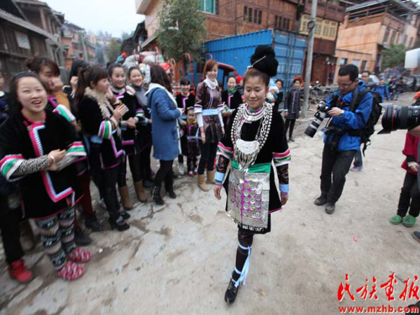 新娘走秀和鬼師做法是婚禮儀式的一項主要內(nèi)容。新娘走秀在第一天上午九時舉行,這是新娘唯一向眾人展示自己的機會也是婚禮中最為隆重的儀式,這時街心廣場及道路兩側擠滿了看熱鬧的群眾。之前新娘們都要精心打扮一番,穿上嶄新漂亮的傳統(tǒng)衣裙,戴上各種銀飾,然后在親人的目送下離開家門。新娘走秀與漢族結婚的迎親有很大不同,沒有新郎伴娘的陪伴,更沒有車水馬龍的迎親隊伍,只是一人獨身前行。鬼師做法在新娘登場后進行,我們只是見到了鬼師做法后留下的一些物品。