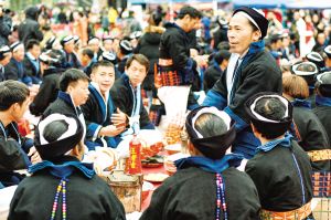 每逢重要節(jié)日,白褲瑤群眾都有舉辦長席宴的習俗。以前,芭蕉葉當作盤子,芭芒干折成筷子,一個飯團、一塊牛肉,再加一碗酒,就是長席宴的全部。現(xiàn)在改變了很多,但不變的是白褲瑤自然、和諧、平等的美德。2019年2月拍攝。