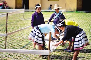 跑紗。白褲瑤的婦女們是天生的藝術家,女子要學會一整套的制作工藝。織布前,先把紗線理好繞成捆。大多是幾個鄰居互相幫忙才能完成。在跑紗過程中,也是婦女們交流技藝、聊家長里短的開心時刻。2014年5月拍攝。