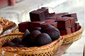 逢年過節(jié)或來了至親好友、土家人的餐桌上往往會擺上一碗血豆腐。血豆腐是土家族傳統(tǒng)菜。用新鮮的豆腐加上干凈的豬血,拌以食鹽、辣椒、花椒、桔皮、肥肉末,用手捏成塊狀,放在柴草煙上熏烤,以表面稍黑,內(nèi)質(zhì)稍硬為度。食用時可以切成薄片,加以豬肉爆炒,也可以切成細(xì)絲,加上辣椒、香蔥炒制。入口時,令人覺得清香酥軟,大開胃口,是一道下酒佐食的佳肴。