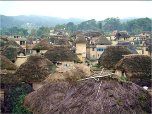 哈尼族一個(gè)核心的家庭的一幢完整的磨菇房,包括正房、左右?guī)?、庭院和圍墻等?shù)個(gè)建筑單元,家中配有腳碓、石磨、水缸、織機(jī)、藍(lán)靛染缸、犁、耙、刀、斧、鋤、籮和火塘等生產(chǎn)生活設(shè)施,滿足作為社會(huì)生產(chǎn)和生活單位的家庭的諸多需求。若干家庭的磨菇房逐次排列,就逐漸變成了一個(gè)哈尼族山寨的磨菇房群落。