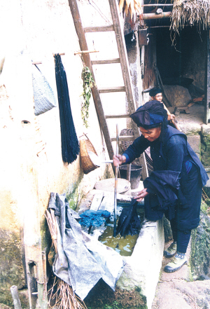 紡紗、織布、藍(lán)染,是哈尼族婦女制作服裝的重要組成部分。她們?cè)诳棽记耙龅臏?zhǔn)備工作,就是操動(dòng)制線機(jī),把一根根短小的線連接起來,捲在小木棍上,然后操動(dòng)絞線機(jī),把線棍上的線分開絞在木梭子和木輪子上。接著是分線,人數(shù)不限,但不能少于5人,一般10米為一組線??棽紩r(shí),在織布機(jī)上方搭起兩排密集的線網(wǎng),當(dāng)雙腳踩動(dòng)踏板時(shí),兩排線網(wǎng)一上一下地交叉移動(dòng),將拖著線的梭子一次次地左右穿梭于線網(wǎng)中。這樣重復(fù)地進(jìn)行,就織出一筒筒布,一般10米為一筒布。最后把織成的布放入靛缸里泡洗,曬干后就可以制作服裝了。