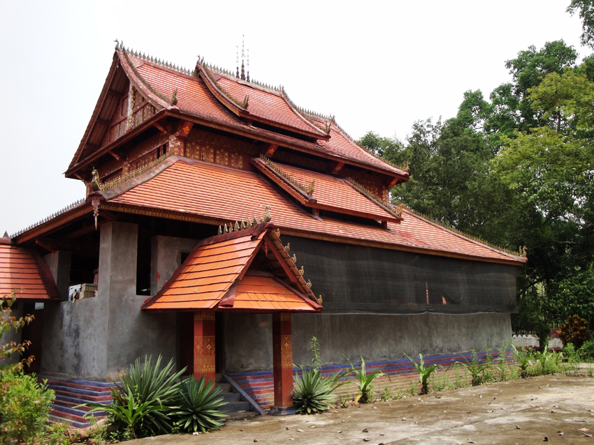 佛寺建筑是信仰小乘佛教的傣族地區(qū)建筑的一大特色,以落地重檐多坡面平瓦建筑為主。由大殿、僧舍和鼓房組成,中心佛寺外加一座戒堂、一座藏經(jīng)樓、一座佛塔。主殿外觀一般是單檐或重檐歇山式屋頂,或懸山式頂、多角或亞字形重檐歇山式頂。坡面進(jìn)行一至二次跌落后有兩層或上中下三層的單面坡或三面坡、五面坡,坡面的多少和佛寺的級(jí)別有關(guān)。屋面按縱向分為兩段式或三段式或五段式,以中間最高,使龐大威嚴(yán)的屋面呈現(xiàn)出優(yōu)美起伏的曲線。