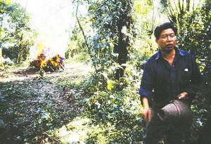 進入墓葬地,茂盛的野草,蔽日的樹林,不時進入眼簾的墳堆,還有一伸一縮往人腳上爬的螞蟥,讓人毛骨悚然。來到一塊剛砍過的開闊地,中央挖了一個坑,里面滿是倒插著的樹柴,柴堆上還放著兩個舊汽車輪胎。巖化告訴我說:“一次火葬需要兩拖拉機柴,如果死者家里沒有柴,我們就會每家湊一兩根,直到湊夠為止。用車輪胎是為了更好的燃燒。”人們把棺材停放在柴堆的左側(cè),將“恒叫”取下,巖約將棺材蓋板掀開,用從家里帶來的一個竹筒里的水朝死者臉上倒。巖約告訴我:“這是給死者洗臉,幫她打扮一下。”然后,大佛爺開始念經(jīng),經(jīng)文的大意是:“山上的神啊,我們的親人到這里居住,你們要好好服侍她,把周圍看管好!邪惡的鬼啊,這里是我們親人應有的地盤,你們不得侵犯,你們不要來擾亂!”念完,就一個人先走了。然后,人們雙手合掌,掌中緊握一根蠟條,圍著轉(zhuǎn)了三圈,婦女們也先走了。邊走還邊相互告誡,不要回頭看,不然死人的鬼魂會跟著你走。剩下的男人將棺材抬上柴堆,將用白布裹著的死者,頭朝寨子,腳朝外,意思是你已從寨子出來了,以后再也不準回寨子了。用柴壓著,又把棺材砸碎,將棺材碎片也堆放上去,有人就拿來一個塑料桶,開始往上潑澆柴油,并從寨子的這方先點火。一會兒,熊熊的大火便燃燒起來。有人拿著用礦泉水瓶子裝著的酒給大家倒,輪流喝。喝過一圈后,他們摘下一枝樹枝,往自己的衣襟前后拍打一陣,將樹枝扔進火里。巖化說:我們要走了,這樣做是把身上的鬼氣趕盡。我也敢緊學著他們的樣子做了一通,便隨人們離去。