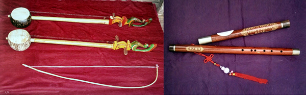 傣劇是在傣族民間歌曲和歌舞音樂的基礎(chǔ)上發(fā)展起來的,并借鑒了漢族戲曲藝術(shù)的表現(xiàn)手段,流傳于德宏、保山、臨滄等傣族聚居區(qū)。傣劇包括多種男女唱腔,男腔多用羽調(diào)式,女腔多用徵調(diào)式。20世紀(jì)50年代以來,傣劇吸收了多種傣族民歌和舞曲,豐富了唱腔,增強了音樂的表現(xiàn)力。傣劇唱腔基本是上下句組成的樂段及其變化反復(fù)。由于唱詞字?jǐn)?shù)可多可少,因此唱腔樂句長短不一。過去,傣劇只用小堂鼓、鑼、镲等伴奏,后逐步采用了多種民族樂器及西洋管弦樂器,組成新型的傣劇樂隊。傣族的民族樂器屬于吹奏樂器的有篳、葫蘆簫(如圖)、豎笛、木葉等;彈撥樂器有玎琴、口弦等;弓弦樂器有西玎(玎琴)、牛角玎(牛角琴)等;打擊樂器有象腳鼓、光隆、光邊、光邦、鑼、镲等。象腳鼓、鑼、镲的合奏是傣族器樂合奏的主要形式。