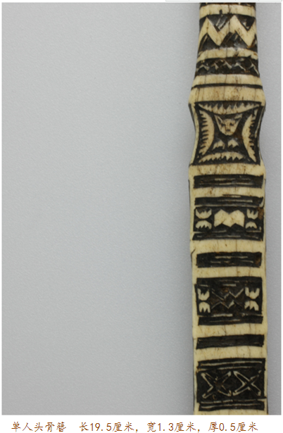 骨簪頭部以下是充滿幾何感的水波紋、山形紋、米字紋、圓形紋,留白之處有魚紋、花紋以及少許文字。文字或是雕刻者本人,或是其心愛之人。一般頭像處或中部系有幾束彩色料珠的紅纓穗飾物用以盤繞發(fā)髻上,或是以銀鈴、銀片來裝飾。
