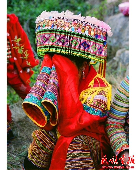 刮臉回來后,張正秀就由姐妹陪伴在閨房。屋外送親的酒席在熱鬧中開席時(shí),舅母就回到閨房里為她洗臉洗腳,改換嫁衣。按傳統(tǒng)習(xí)俗,要把新娘用過的水潑灑在閨房的地上,以示吉利。新娘穿上由親人縫制的繡花衣裙,從頭到腳煥然一新。穿戴整齊后,新娘由伴娘陪同坐在閨房門旁的草地上接受祝福。女方家請(qǐng)的懂禮儀的阿巴莫(司儀)手持菜花和松針葉在堂屋敬女方家神,告訴家神姑娘要出嫁了,并給前一天夜里來新娘家領(lǐng)親的兩位娃拿扒(證婚人)挎上兩條交叉打結(jié)的紅布,表示娃拿扒已承諾為女方家領(lǐng)親。