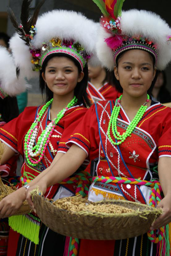 高山族女子的傳統(tǒng)服飾有長裙、長衣、護(hù)腳布等。長裙長至腳踝,以三至四幅布拼接成大正方形圍于腰,有系一條的,也有系兩條的,穿法有前后疊穿和左右疊穿兩種,雅美、邵和卑南女子有一種“披肩裙”,把大披肩斜系于肩,或一塊,或左右各一塊,系上腰帶,宛如現(xiàn)代女子的連身長裙,披肩裙外再系一塊胸兜或外罩短上衣;布農(nóng)、排灣、魯凱人女子穿長衣,形制如漢族女子的大襟有袖圓擺襖,衣長至小腿中段;護(hù)腳布是兩塊長方形布,用系帶綁于小腿,寬不足以包裹整個小腿,多掩前敞后。