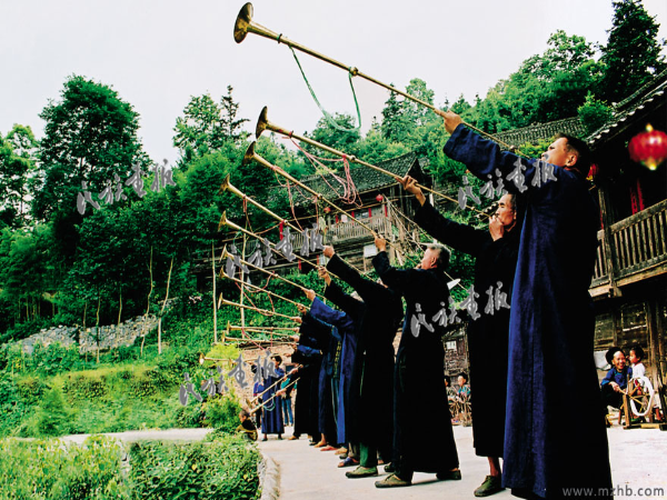 水族的民間音樂有其獨特的民族風格,尤其是民歌,形式多樣。水族民歌按其形式可分為單歌、雙歌、蔸歌、調歌、詰歌等;按其內容則可分為古歌、頌歌、生產歌、風物歌、風俗歌、酒歌、情歌等類別。雙歌是水歌中最富有特色的一種說唱形式。雙歌以組為單位,分歌前的說白和主體的吟唱兩部分。雙歌,尤其是寓言性的雙歌,十分幽默、風趣,寓意不直接表露,必須根據(jù)當時演唱氣氛結合歌的內容去揣摩。水族情歌按照從相會到結婚整個戀愛過程來分,可分為:青春歌、惜春歌、見面歌、分別歌、約會歌、求愛歌、想念歌、定婚歌,也有一部分反映婚姻不能自主的苦情歌、分離歌、逃婚歌。按照對酒歌內容的理解,水族酒歌分為兩種:一是歌曲內容與酒有關的歌,如釀酒歌、敬酒歌等;二是喝酒時唱的歌。水族民歌的特點是曲調變化不大,旋律較為簡約,但歌詞常因時因事因人而不斷充實新的內容,以抒發(fā)自己的感情。