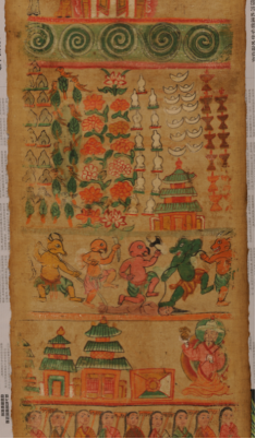 納西族東巴教的長幅布卷畫,通稱為“神路圖”,它是東巴教繪畫中的巨作。此類畫一般長10-20米,寬1尺左右,有“古代宗教繪畫第一長卷”之譽。文化內(nèi)涵異常豐富,在國際學(xué)術(shù)界被視為宗教繪畫一絕。如今,此畫已成稀有之物。很少見到尚留存民間的神路圖了?!吧衤贰敝鉃闁|巴為死者評斷、指點通往神地之路,把他們從地獄的煎熬中解脫超度出來,轉(zhuǎn)生為人,送至神靈之地。在納西族的喪葬和超度亡靈儀式上,根據(jù)神路圖導(dǎo)引死者靈魂進入新的生命場是一件極為重要的大事。到時,要把神路圖展開,眾東巴站于圖旁依次詠誦8冊《神路圖經(jīng)》,為死者評斷路徑,導(dǎo)引亡靈穿越鬼地;擺脫惡鬼的種種折磨。在納西族實行傳統(tǒng)安葬習(xí)俗時,要在安葬場鋪開神路圖,把圖上的鬼地部分朝著死者頭部,向東北方向鋪開。往東北方向鋪的意思是死者靈魂將回歸東北方向的納西遠祖之地。把死者靈魂送到“祖先之地”是納西族的古代民俗。各地納西族都有十分詳細的送魂路線,靈魂返祖地必經(jīng)的每一個地名都在口傳和寫于東巴經(jīng)的送魂路線中標出。其畫面所繪鬼神人三界有數(shù)百個人神鬼獸的形象和很多具有宗教象征意義的物象,有佛像、神像、各種動物神,七八十個奇禽異獸以及東巴跳神的舞蹈布局,畫卷內(nèi)容以靈魂不滅,因果報應(yīng),生死輪回等佛教信條為指導(dǎo),用連續(xù)性和富有戲劇性的畫面表現(xiàn)人死后亡魂不滅。