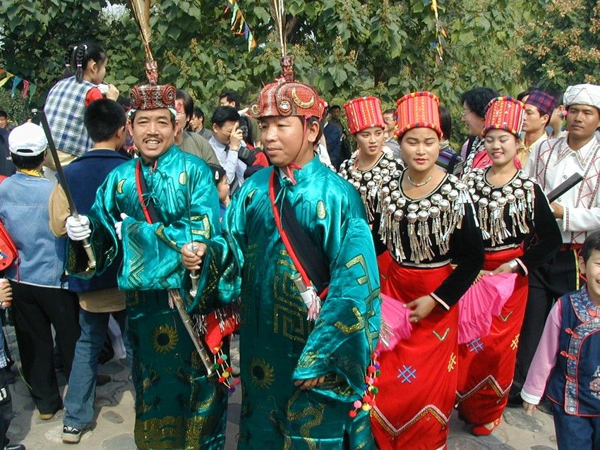 目瑙節(jié):又稱(chēng)“總戈”,景頗語(yǔ)音譯,意思是“大伙跳舞”。目瑙節(jié)是景頗族最盛大的傳統(tǒng)節(jié)日,一般于每年農(nóng)歷正月十五以后的九天內(nèi)擇雙日舉行,節(jié)期三至五天不等。目瑙作為一種大型的群眾性歌舞活動(dòng),由來(lái)已久,歷史上,每逢豐年,出征、凱旋、婚姻嫁娶、敬祭鬼神等重要活動(dòng),均要跳“目瑙”。景頗族的“目瑙縱歌”原來(lái)是一種融宗教和文化習(xí)俗為一體的傳統(tǒng)慶典。隨著社會(huì)的發(fā)展,逐漸演化為各種不同類(lèi)別的“目瑙”。大致有以下幾種:①“歲目瑙”,家庭財(cái)源茂盛,人丁興旺時(shí)舉行;②“布當(dāng)目瑙”,征戰(zhàn)取得勝利時(shí)舉行;③“貢冉目瑙”,同胞兄弟分家自立門(mén)戶(hù)時(shí)舉行;④“騰肯目瑙”,新建房屋住所落成時(shí)舉行;⑤“空然目瑙”貴族家娶親辦婚禮時(shí)舉行;⑥“達(dá)如目瑙”,出征時(shí)舉行;⑦“昔目瑙”,有名望的長(zhǎng)者去世送葬時(shí)舉行;⑧“柱目瑙”,祭奠“木代”神時(shí)舉行。不同類(lèi)別的“目瑙”都有特定的內(nèi)容和表現(xiàn)形式,但有一個(gè)共同點(diǎn)就是整個(gè)過(guò)程都是由“瑙雙”(領(lǐng)舞)隊(duì)和“瑙巴”(表演)隊(duì)組成的舞隊(duì)來(lái)表現(xiàn)和完成的。每逢目瑙節(jié)日,村村寨寨的景頗人身著節(jié)日盛裝,紛紛從四面八方涌入目瑙廣場(chǎng)。廣場(chǎng)上人山人海,氣氛熱烈歡快而不失莊嚴(yán)古樸的特色。廣場(chǎng)中央高豎著四根長(zhǎng)約4米的目瑙柱,亦稱(chēng)雌雄柱,中間兩根為陰,外面兩根為陽(yáng),上面皆繪有精美而富有象征意義的圖案:右邊柱上往往繪以蕨菜花紋,象征團(tuán)結(jié)奮進(jìn);左邊常畫(huà)回紋構(gòu)成若干個(gè)四方形,并涂以不同顏色,表示景頗族的遷徙路線(xiàn);中間兩根柱子之間,交叉著兩把長(zhǎng)刀,為景頗民族驍勇強(qiáng)悍、堅(jiān)強(qiáng)剛毅性格的具體標(biāo)志。目瑙柱的左側(cè)立著一個(gè)方形架子,上層是吹嗩吶的座位;前面掛著一個(gè)兩米長(zhǎng)的大皮鼓和一面直徑一米多的大芒鑼?zhuān)┨钑r(shí)伴奏用。廣場(chǎng)四周用竹籬笆圍起,目的是為了防止野鬼的侵入和牲畜的干擾。舞蹈開(kāi)始時(shí),鼓樂(lè)齊鳴,由兩位德高望重且又熟悉目瑙舞路線(xiàn)的老人身穿大龍袍,頭戴飾有孔雀、野雞羽毛和野豬牙齒的目腦帽,手持長(zhǎng)刀領(lǐng)頭,后面跟著背銅炮和持長(zhǎng)刀的隊(duì)伍,婦女們拿著扇子或彩帕跟在最后,邊歌邊舞,熱鬧非凡。參舞者少則百多人,多則幾千人,從清晨到日暮,以日暮到清晨,通宵達(dá)旦,其間舞者跳累時(shí)可自動(dòng)退場(chǎng)小歇片刻,然后繼續(xù)登場(chǎng)舞蹈?!澳胯Эv歌”作為一個(gè)民族的傳統(tǒng)活動(dòng)發(fā)展至今,宗教色彩和類(lèi)別已日益淡化,它已成為景頗族約定俗成的傳統(tǒng)節(jié)日,統(tǒng)稱(chēng)為“統(tǒng)肯(傳統(tǒng))目瑙”并賦予了新的內(nèi)涵,其內(nèi)容和形式都是展示一個(gè)民族的傳統(tǒng)文化,反映今天的新生活和對(duì)未來(lái)的美好向往。