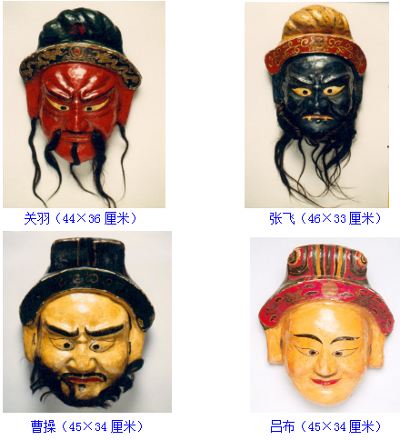 反映三國內(nèi)容的舞蹈有“五官”“三將”“五將”“關(guān)老爺”等內(nèi)容。面具角色有劉備、關(guān)羽、張飛、曹操、呂布等。表演動作疾緩有序,再現(xiàn)了三國時(shí)驍將馳騁疆場的場面。