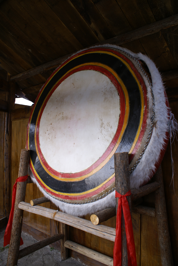 羌族羊皮鼓是打擊樂器,又名“羌鈴鼓”,羌語稱“切歐兀”“切熱別日木”。有兩種形狀,一種是圓形鼓面的鈴鼓,直徑大約30—40厘米。鼓邊寬約15厘米,鼓柄置于正中,抓柄的長度與鼓面的直徑相同,左手從背面握柄。另一種是扇子形狀的鈴鼓,鼓框和鼓柄為鐵制,抓柄端有一裝飾環(huán)圈,圈內(nèi)串以數(shù)個銅錢。兩種形制鼓面均蒙羊皮,各鼓音高低不一,鼓錘為竹制,敲擊的一端略微呈弓形。羊皮鼓的打法和鼓點的節(jié)奏變化豐富。目前,搜集到的有硬三鞭、軟三鞭、野雞撲、偷點子、牛擦癢等十多種。這些鼓點穿插在每個唱段與舞蹈銜接變化中,使表演者在統(tǒng)一的步伐、統(tǒng)一的動作中,調(diào)節(jié)了節(jié)奏氣氛。由于表演具有即興式特點,表演者的技術(shù)嫻熟程度和思想情緒變化將直接影響技巧的發(fā)揮。羊皮鼓突出鼓的表演,氣氛熱烈歡快,動作粗獷質(zhì)樸,如“禳星辰”動作,就是在鼓點、唱腔、動作的有機(jī)結(jié)合中,表現(xiàn)出凜冽的氣勢。羊皮鼓在表演中,不僅給舞蹈提供了節(jié)奏,豐富了氣氛,而且鼓點的擊打更形成和衍化出許多獨特的舞蹈語匯。