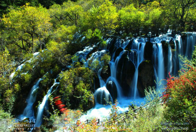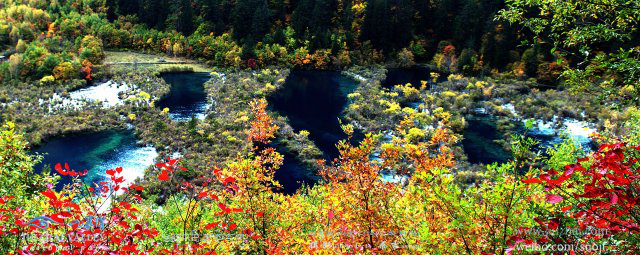 九寨溝四周群山聳峙,有雪峰數(shù)十座,高插云霄,終年白雪皚皚。河谷地帶奇水薈萃,其間有成梯形分布的大小湖泊114個,瀑布群17個,鈣華灘流5處,泉水47眼,湍流11段,以1870米的海撥高差,在12 座雪峰之間穿林跨谷,珠連玉接,呈Y字型串珠,逶迤近60公里,形成了中國唯一、世界罕見的以高山湖泊群和瀑布群以及鈣華灘流為主體的風(fēng)景名勝區(qū)。湖泊小者數(shù)平方米,最大的長海長達(dá)7公里。湖水終年碧藍(lán)澄澈,色彩斑讕,在陽光照射下,呈現(xiàn)出藍(lán)、黃、橙、綠等多種色彩,絢麗奪目。天氣晴朗時,藍(lán)天、白云、雪山、森林倒映湖中,水光浮翠,美麗如畫,并隨季節(jié)推移呈現(xiàn)出不同的色彩和風(fēng)韻,有“九寨歸來不看水”之說。