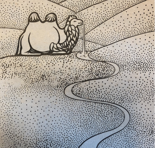 高興之際,大家想起了馱經(jīng)馱水土的駱駝;但是人們四下里一看,白駱駝不見了。真是,為了找水喝竟把勞苦功高的駱駝丟失了!大家找呀,找呀,找了一夜還沒找到,天亮?xí)r,又回到燒茶的地方,然后順?biāo)希^續(xù)尋找。走不多遠(yuǎn),發(fā)現(xiàn)駱駝在前面靜靜地臥著,人們高興極了,有一個人三步兩步跑上去拉駱駝,可是駱駝一動也不動。眾人上前詳細(xì)一看,白駱駝已變成了石頭。那石駱駝在水里臥著,一股清水從它的嘴里噴出來,散發(fā)看清香的氣味,流向遠(yuǎn)方。