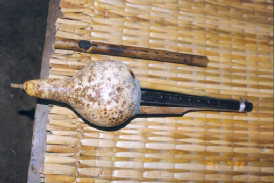 阿昌族的樂器主要有竹琴、洞簫、葫蘆簫(右圖,劉軍攝)、三月簫、銅口弦、三弦、象腳鼓(下圖,蒙哥提供)、铓鑼等。葫蘆簫是用葫蘆連接三根竹管制成的,它有7個音,音量小,音調(diào)低緩圓潤,一般晚上用。三月簫用一根竹管制成,也有7個音,它的音量大,音色細亮,多在白天使用。葫蘆簫和三月簫不僅是阿昌族人民心愛的傳統(tǒng)樂器,還是男女青年傳情示愛的媒介。