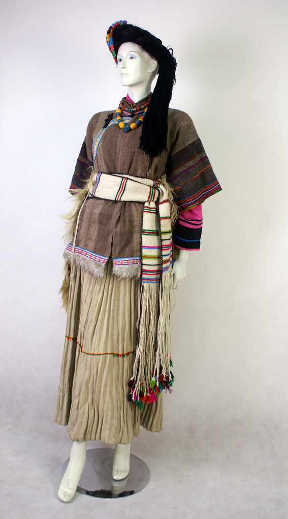普米族婦女的上衣為黑色、蘭色、白色的開襟短衣,和男子基本一樣,但袖口有花邊,領口用花線繡上吉祥的圖案。下身著百褶筒裙,裙腳邊加一圈紅線,裙襠口加一圈白色厚布,裙腳寬大,縫成褶皺形狀,一般需布匹二丈多。腰間系一根彩帶,彩帶多用山麻或羊毛捻線織成。日常生產生活中,普米族婦女喜歡穿羊皮褂,皮褂有兩種,一種是有袖子的開衫皮褂,一種是不作任何加工縫制的披肩皮褂,一般多用披肩皮褂。青年婦女均穿短上衣,古代是用麻制的,現代大多用棉布;過去多喜歡白色,現在喜用白黑紅等多種顏色;右面開襟,下襟較短,窄袖高領。春天她們穿用條絨縫制、領和衣邊鑲嵌金銀邊的夾衣,稱金邊衣服。