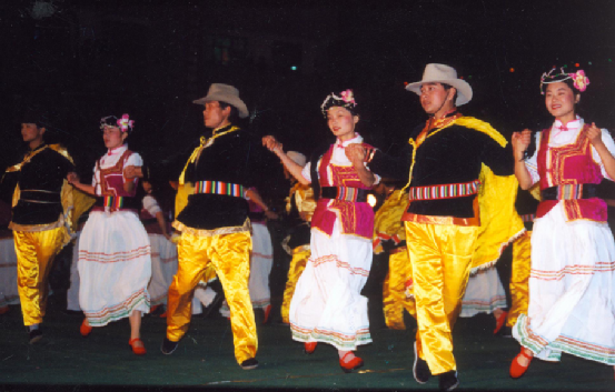 普米族的民間娛樂舞蹈,普遍具有歌、舞、樂三位一體的特點。舞蹈形式正如普米族民歌所唱的:“如金線把珍珠穿成一串,手拉手跳成十五的月亮。”娛樂舞蹈全是手拉手轉(zhuǎn)圓圈的舞蹈形式。人們挽手而跳,伴以高亢洪亮、情感激越的唱詞。特別是普米族婦女雪白的長裙隨舞步輕盈飄旋,似白鷺翻飛,正如《打跳歌》中所唱的:“笛聲不停莫歇腳,舞場上沒有陡巖子,腳底板下沒有刺,跳它個地動山也搖?!痹谙矐c的集會之夜,歡快的娛樂性舞蹈,往往一跳就是通宵達旦。跳鍋莊是普米族傳統(tǒng)的舞跳形式,這種舞蹈不受時間空間的限制,只要一支竹笛或葫蘆笙,有一塊空地即可進行,少則三五人,多則數(shù)百人。一般總是在傍晚,在院內(nèi)或場壩上舉行。跳舞時,總要在中間燃起一堆火,與室內(nèi)的鍋莊相似,所以稱之為鍋莊舞。鍋樁內(nèi)容很豐富,從古代的游牧、狩獵、紡織到今天的趕街、慶豐收、烤酒等都有反映。流行的曲調(diào)有《放單調(diào)》《出山》《獅子舞》等等?,F(xiàn)在,鍋莊舞已發(fā)展成為集唱詞、曲調(diào)、舞蹈、音樂于一體的綜合性歌舞藝術(shù)。