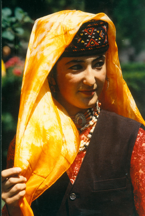 塔吉克族的服飾以帽子最具特色,男子一般戴黑絨、圓形、高統(tǒng)帽。女子一般戴帶圓頂、繡花棉帽,帽子的后半部垂有后簾,出門時(shí),帽子外可以加披方頭巾,一般多為白色,新娘通常會(huì)選擇紅色,小姑娘有時(shí)候用黃色。