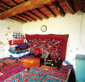 新疆維吾爾自治區(qū)木壘縣大南溝烏孜別克民族鄉(xiāng)鄉(xiāng)政府為烏孜別克牧民集中興建了定居房。新村街道整齊,土墻圍成的院落獨門獨院。院落很大,前院種菜栽樹,有水井,房后是牛欄羊圈。有的還單建了廂房作廚房。這里的住房都是長方形土坯平頂房,玻璃窗,墻壁很厚,冬暖夏涼。屋內(nèi)橫梁和走廊的木柱、木梁上有的是工筆重彩的花紋圖案,有的用雕花石膏鑲嵌或磚、木雕刻后鑲嵌,做工精細。墻壁上有整齊排列的拱形壁龕,里面擺著日用品和工藝品,四周也鑲嵌著花紋圖案。居民們住板炕,在屋里地上挖一小坑,坑內(nèi)放置火爐,鐵皮煙囪通向室外,坑上橫搭木板成板炕,板炕上鋪花氈坐毯。靠墻一邊擺著疊得整齊的被褥,繡花枕頭對稱地立在被褥上。墻上掛著壁毯,整個室內(nèi)既有局部美,又有整體美,賞心悅目。