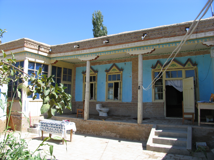 土房的墻一般都很厚,里面粉刷石灰,有的還掛壁毯。墻壁多用石灰刷成淡藍(lán)色,安雙層玻璃窗,內(nèi)層為活動式,夏天可以取下,窗外有木屜子,起保護(hù)作用。窗戶上還開有小孔,以便通風(fēng)。房內(nèi)的地面為水泥或磚面。室內(nèi)除有的搭火炕外,其它的裝飾和木房的一樣。不論哪個房間,都可作為臥室,也用于待客,廚房和儲藏室單建,有的還單建馕坑。
