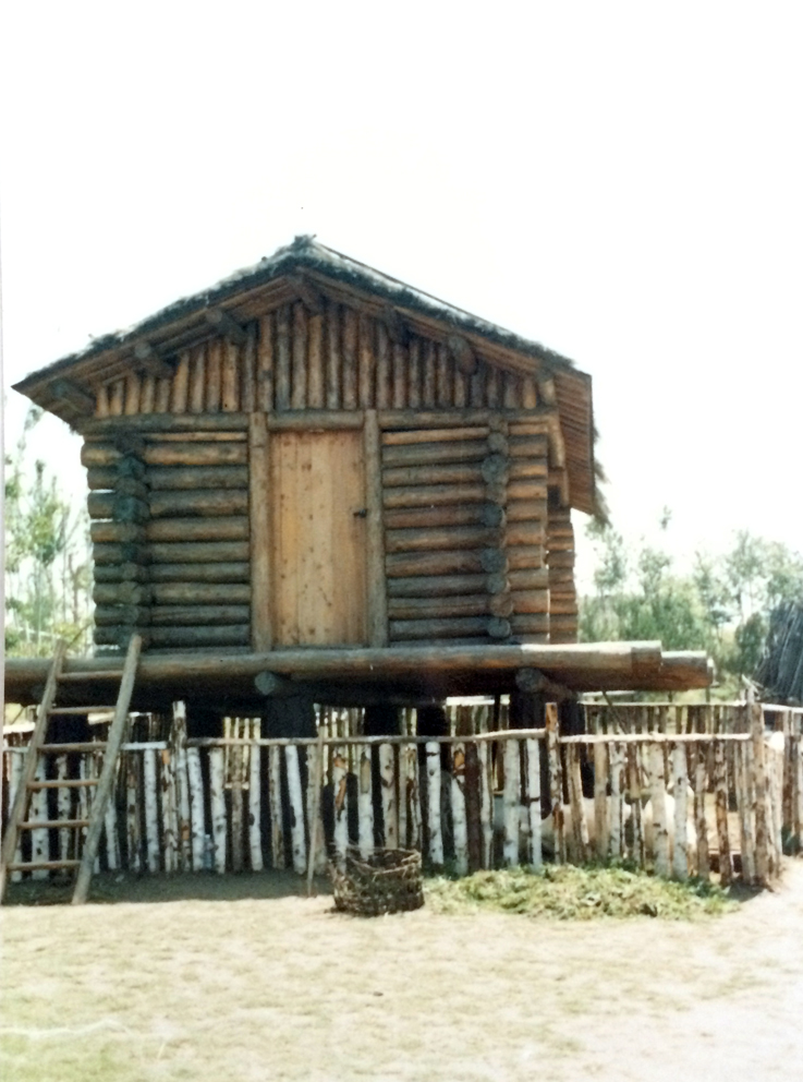 早期,每一個家族公社都有一個公用的高腳倉庫,鄂倫春語叫“歐倫”,一般是在游獵的中心地帶,選擇四棵自然生長、成對角的樹,在距地面約3—4米高的地方留一個樹杈,砍掉其余的樹頭,樹杈上架兩根直樹干,樹干上面一根挨一根地平鋪木桿成為底座,底座上用木桿壘一個“木刻楞”小房或用樹枝做一個半圓形的架子,覆蓋樺樹皮,然后用藤條或樹皮綁縛固定。一側留有進出的小門,借助木梯上下,為防止野獸攀上糟蹋東西,平時都把木梯放倒在一邊。這種倉庫主要存放一些暫時吃不了和用不著的食品和雜物,搬遷時不拆除,里面的東西也不帶走,什么時候需要再騎馬來取。個體小家庭獨立以后,公共庫房變成了私家財產。雖說是私家財產,卻從不留人看守,也不上鎖。獵人在外打獵,如果一時斷糧,可以不經主人允許,隨便到任何一家的“歐倫”中拿走所需要的東西,事后向主人通告一聲即可,以后有了如數奉還,不還主人也不索要。