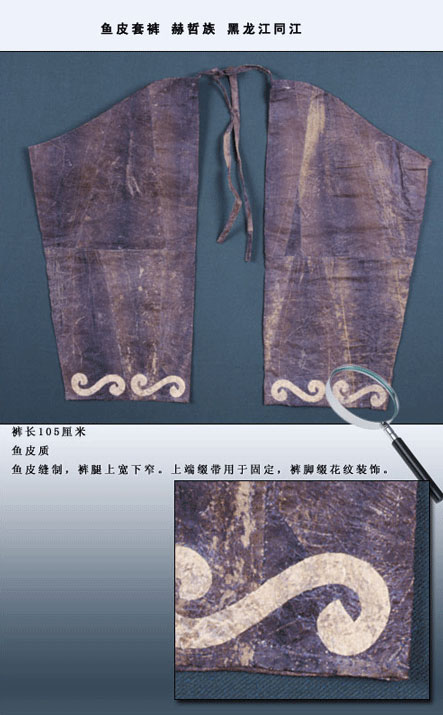 套褲的形式只是兩個(gè)筒形褲腿,沒(méi)有褲腰,男式的上端為齊口,女式的上端為斜口。赫哲族人稱男式魚皮套褲為 “臥又克衣”,褲邊口有皮條,是用來(lái)扎結(jié)用的。赫哲族人稱女式魚皮套褲為“嘎榮”,口呈月牙形狀,前邊到腰部,后邊到大腿根部。如圖所示,女式魚皮套褲,長(zhǎng)105厘米,褲腿上寬下窄,上端系有綴帶,褲腳綴有“S”形紋飾。魚皮褲造型與普通褲子基本一致,褲腰和褲襠部較為寬松肥大,褲腿稍窄些。